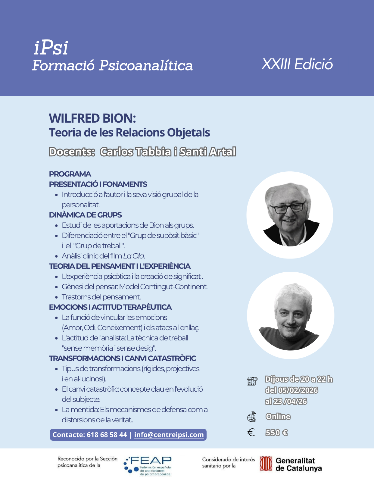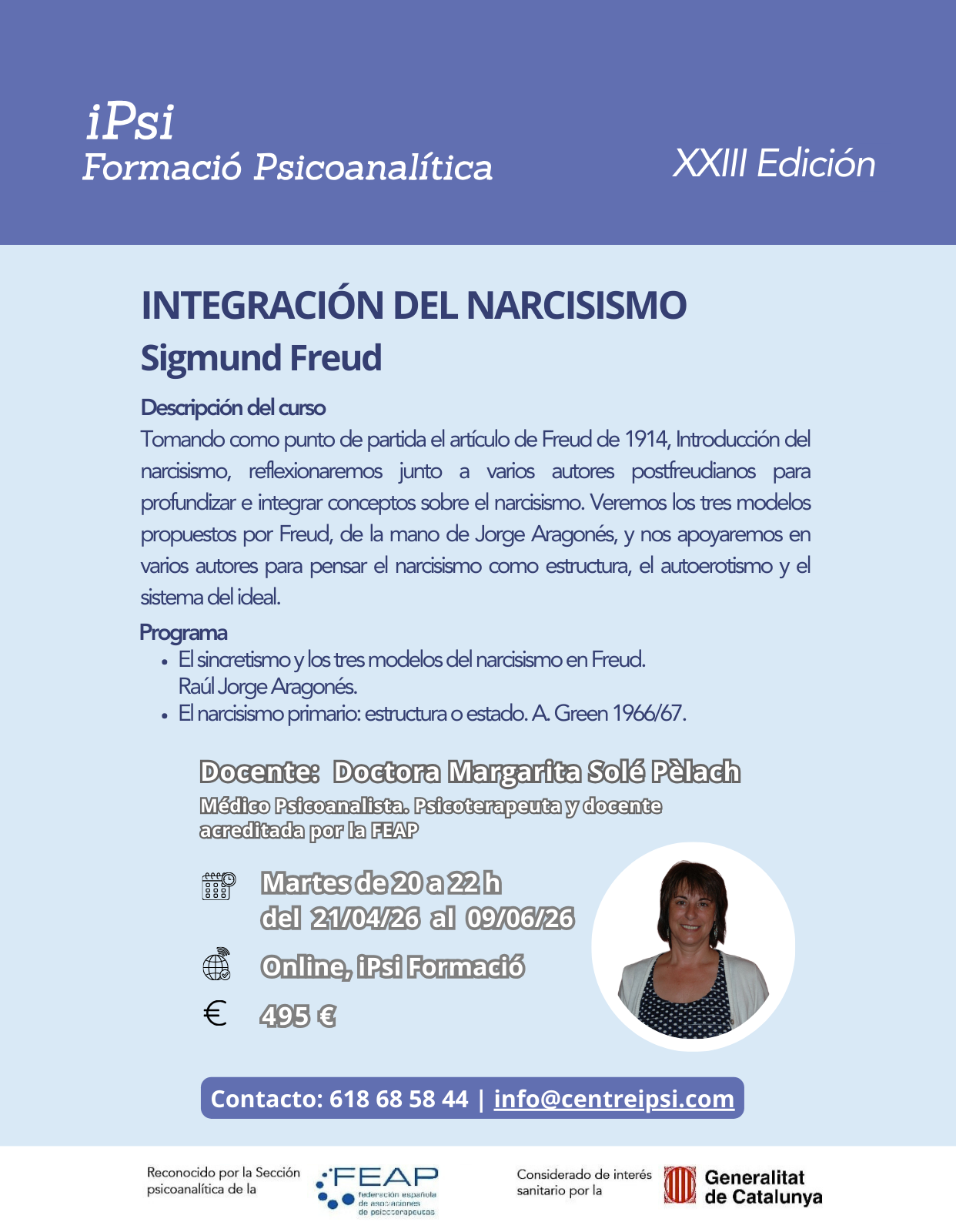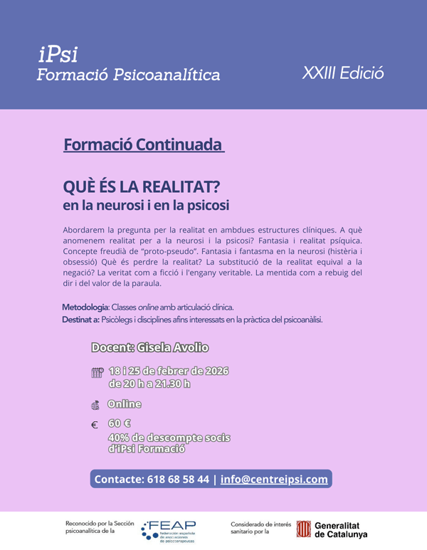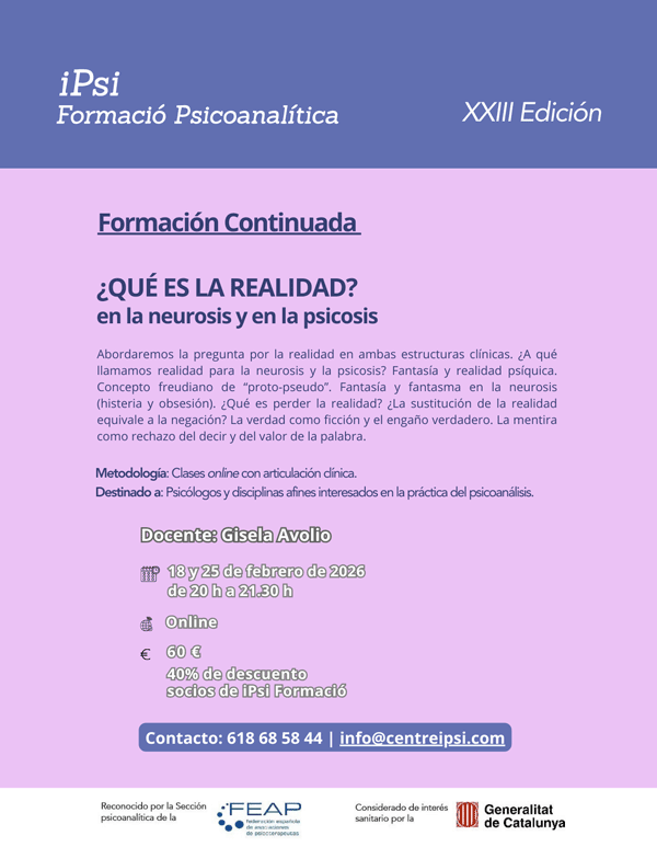 Posgrado en profundización en psicoanálisis.Clases los martes y jueves de 20 a 22 h desde octubre hasta junio.